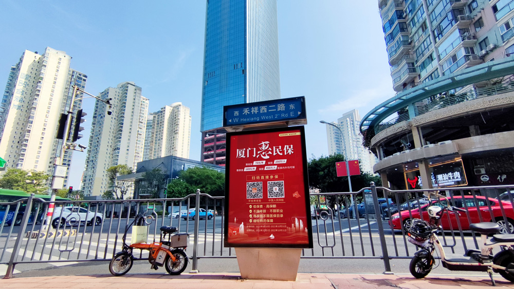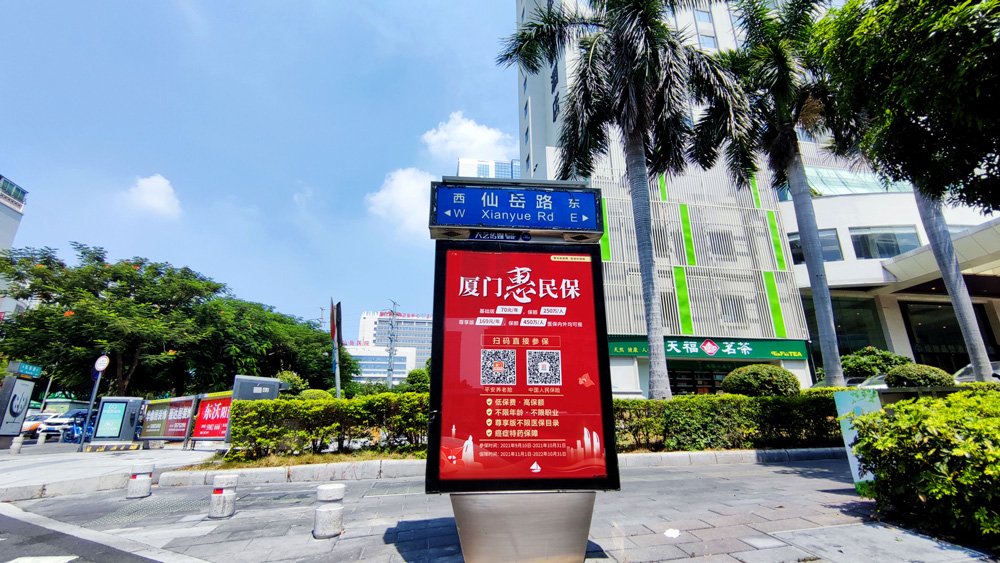 目前“惠民保”在全廈門市島內(nèi)外各個主干道及主干道交叉口、黃金的人流車流途徑處、居民生活住宅區(qū)等路段投放多個城市路名牌、公交車候車亭。