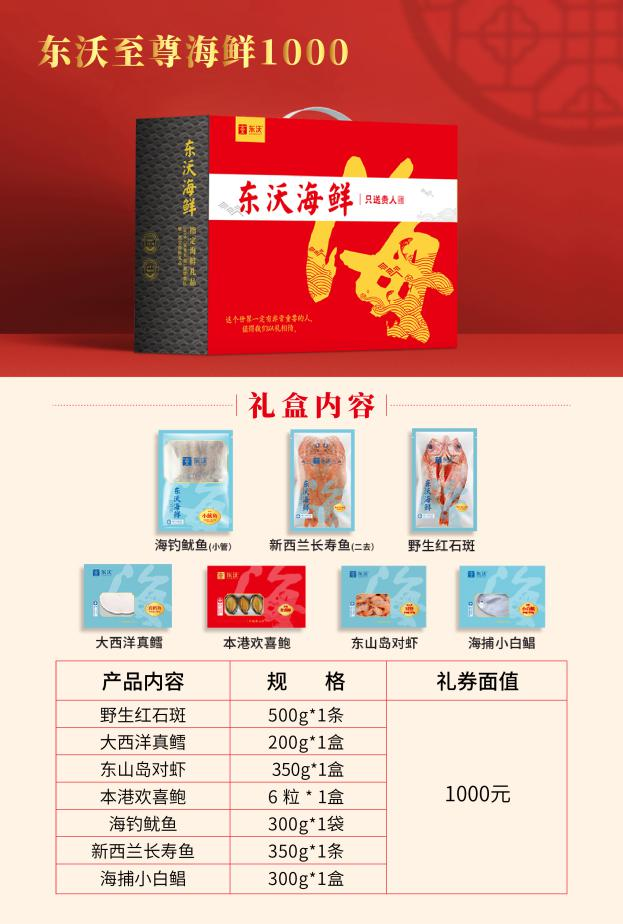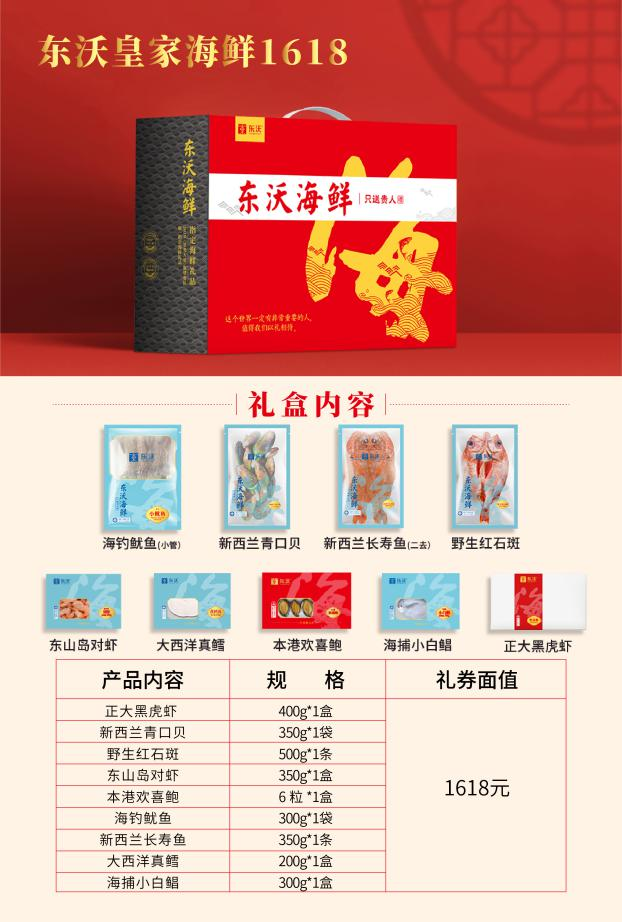 東沃海鮮盛宴禮盒魚、參、鮑、蝦滿滿一盒,將所有極具新年氛圍感、品質高級感的海鮮,將所有對團圓的期盼、對新年的祝福都融入其中。