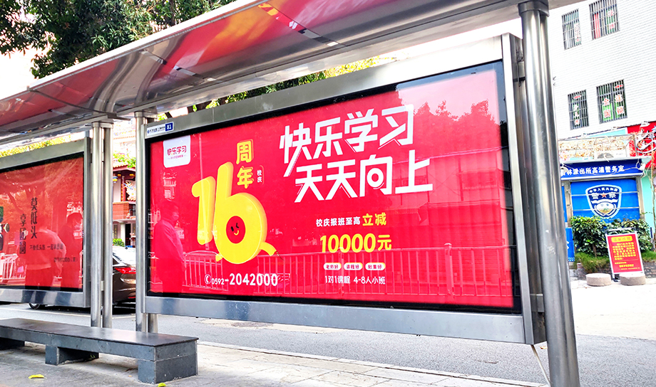 介紹:快樂(lè)學(xué)習(xí)作為廈門(mén)本土知名教育企業(yè),候車(chē)亭范圍覆蓋中小學(xué)周邊,讓學(xué)生和家長(zhǎng)近距離感受戶(hù)外廣告畫(huà)面效果。