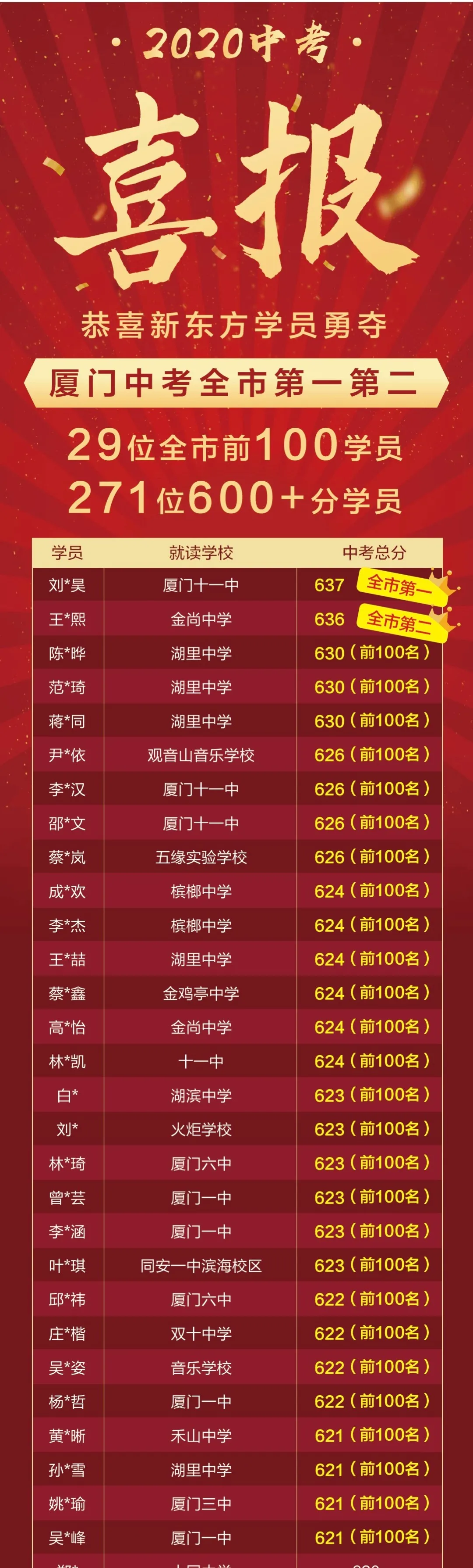 --劉*昊 2020廈門中考637 市裸分狀元 廈門十一中/新東方凌云班學員